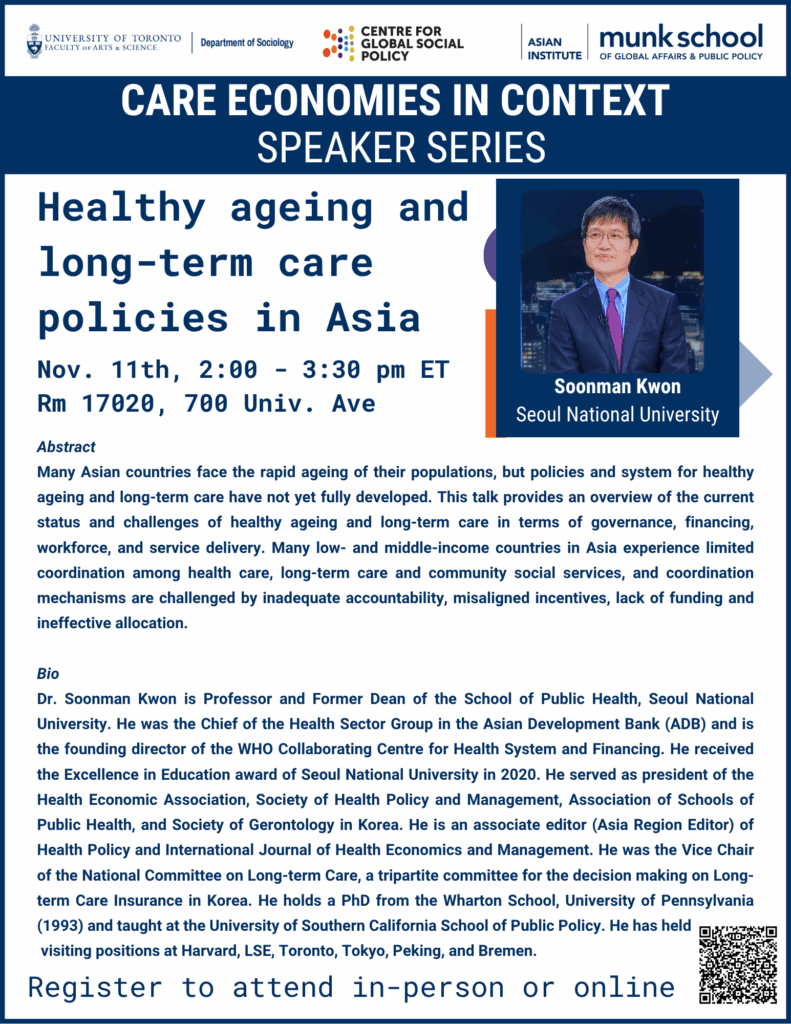 On November 11th, 2025, from 2:00 – 3:30 pm ET, Dr. Soonman Kwon will present a talk entitled “Healthy ageing and long-term care policies in Asia.” This hybrid event is part of the Care Economies in Context Speaker Series, and is co-sponsored by the Asian Institute at University of Toronto’s Munk School of Global Affairs and Public Policy.