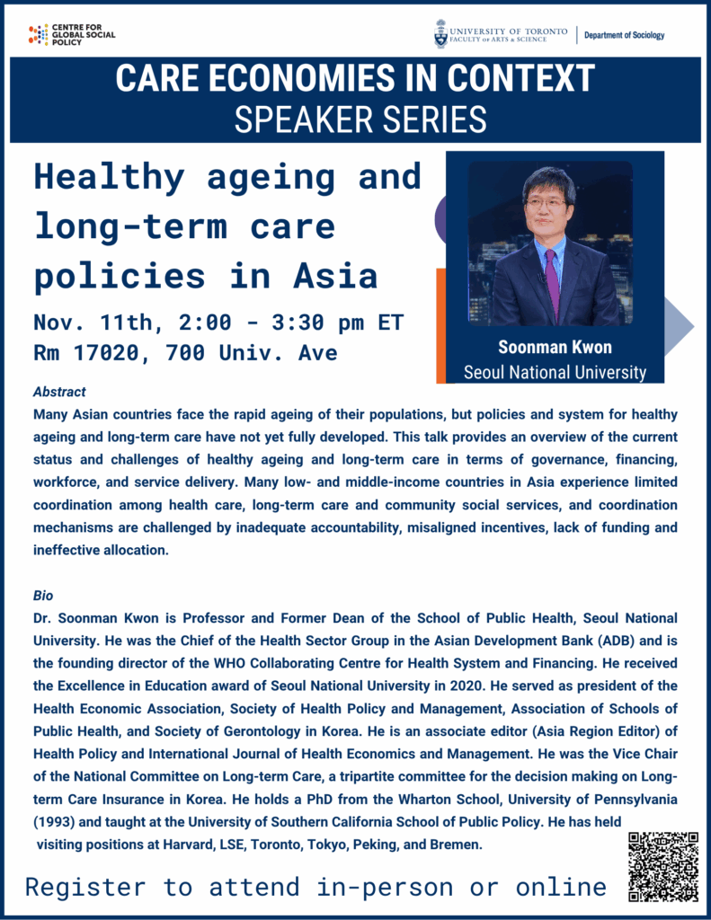 On November 11th, 2025, from 2:00 – 3:30 pm ET, Dr. Soonman Kwon will present a talk entitled “Healthy ageing and long-term care policies in Asia.” This hybrid event is part of the Care Economies in Context Speaker Series.